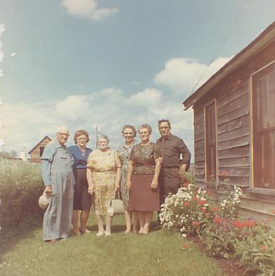 Manuel Ochs, Mary Eichman Nufer, Millie Rourke Nufer, Lea Nufer Harms, Olinda Nufer Betts, and Alvin Nufer. Taken in July 1966 in front of the home of Homer and Olinda Betts.